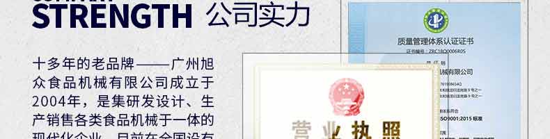 廣州旭眾食品機械有限公司是一家集科研開發(fā),生產設計,營銷服務為一體的現(xiàn)代化生產企業(yè)?,F(xiàn)代化生產車間,精湛制造技術,所產機械歷經(jīng)市場重重考驗,不斷贏得海內外客戶的贊譽。