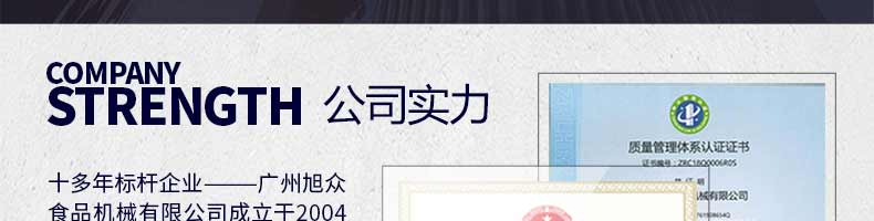 廣州旭眾食品機(jī)械有限公司是一家集科研開發(fā),生產(chǎn)設(shè)計,營銷服務(wù)為一體的現(xiàn)代化生產(chǎn)企業(yè)。現(xiàn)代化生產(chǎn)車間,精湛制造技術(shù),所產(chǎn)機(jī)械歷經(jīng)市場重重考驗,不斷贏得海內(nèi)外客戶的贊譽(yù)。
