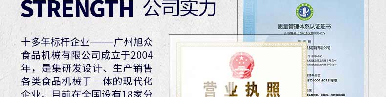 廣州旭眾食品機械有限公司是一家集科研開發(fā),生產(chǎn)設計,營銷服務為一體的現(xiàn)代化生產(chǎn)企業(yè)?,F(xiàn)代化生產(chǎn)車間,精湛制造技術,所產(chǎn)機械歷經(jīng)市場重重考驗,不斷贏得海內(nèi)外客戶的贊譽。
