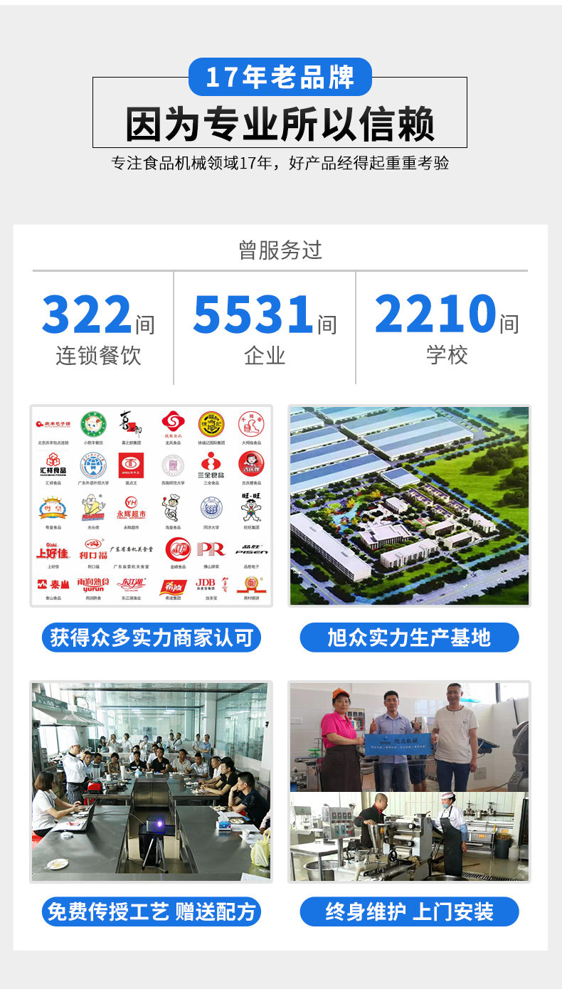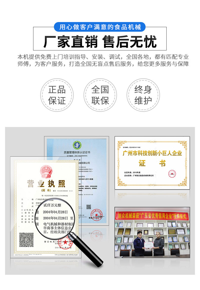 廣州旭眾食品機(jī)械有限公司是一家集科研開發(fā),生產(chǎn)設(shè)計,營銷服務(wù)為一體的現(xiàn)代化生產(chǎn)企業(yè)?,F(xiàn)代化生產(chǎn)車間,精湛制造技術(shù),所產(chǎn)機(jī)械歷經(jīng)市場重重考驗,不斷贏得海內(nèi)外客戶的贊譽。