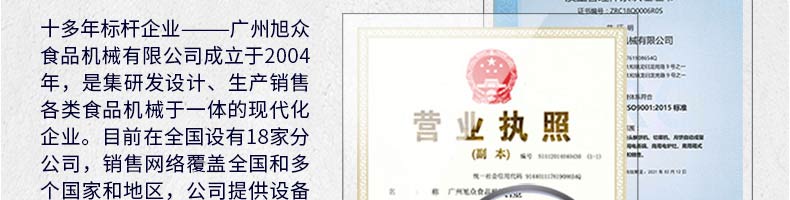 廣州旭眾食品機(jī)械有限公司是一家集科研開發(fā),生產(chǎn)設(shè)計(jì),營(yíng)銷服務(wù)為一體的現(xiàn)代化生產(chǎn)企業(yè)?,F(xiàn)代化生產(chǎn)車間,精湛制造技術(shù),所產(chǎn)機(jī)械歷經(jīng)市場(chǎng)重重考驗(yàn),不斷贏得海內(nèi)外客戶的贊譽(yù)。