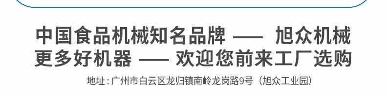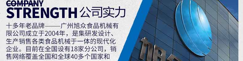 廣州旭眾食品機(jī)械有限公司是一家集科研開發(fā),生產(chǎn)設(shè)計,營銷服務(wù)為一體的現(xiàn)代化生產(chǎn)企業(yè)?,F(xiàn)代化生產(chǎn)車間,精湛制造技術(shù),所產(chǎn)機(jī)械歷經(jīng)市場重重考驗,不斷贏得海內(nèi)外客戶的贊譽(yù)。