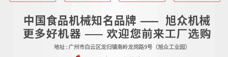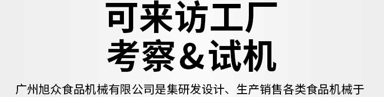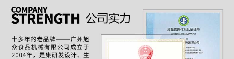 廣州旭眾食品機械有限公司是一家集科研開發(fā),生產(chǎn)設計,營銷服務為一體的現(xiàn)代化生產(chǎn)企業(yè)?,F(xiàn)代化生產(chǎn)車間,精湛制造技術,所產(chǎn)機械歷經(jīng)市場重重考驗,不斷贏得海內外客戶的贊譽。