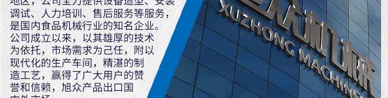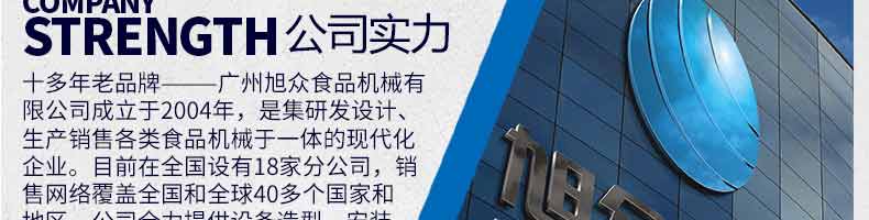 廣州旭眾食品機械有限公司是一家集科研開發(fā),生產(chǎn)設計,營銷服務為一體的現(xiàn)代化生產(chǎn)企業(yè)?,F(xiàn)代化生產(chǎn)車間,精湛制造技術,所產(chǎn)機械歷經(jīng)市場重重考驗,不斷贏得海內外客戶的贊譽。