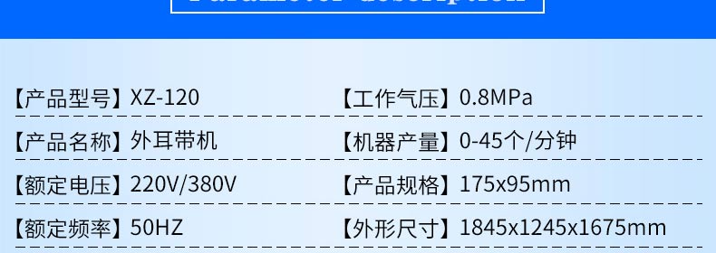 名稱全自動(dòng)耳帶機(jī) 電源220v/380v 功率4.7kw 產(chǎn)量0-45個(gè)/分鐘 尺寸1845*1245*1675mm 重量詳情咨詢13113134411 微信13113134411蔣經(jīng)理 規(guī)格175*95mm 其他氣壓:0.8mpa