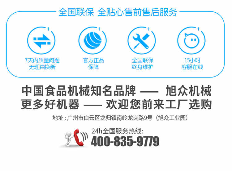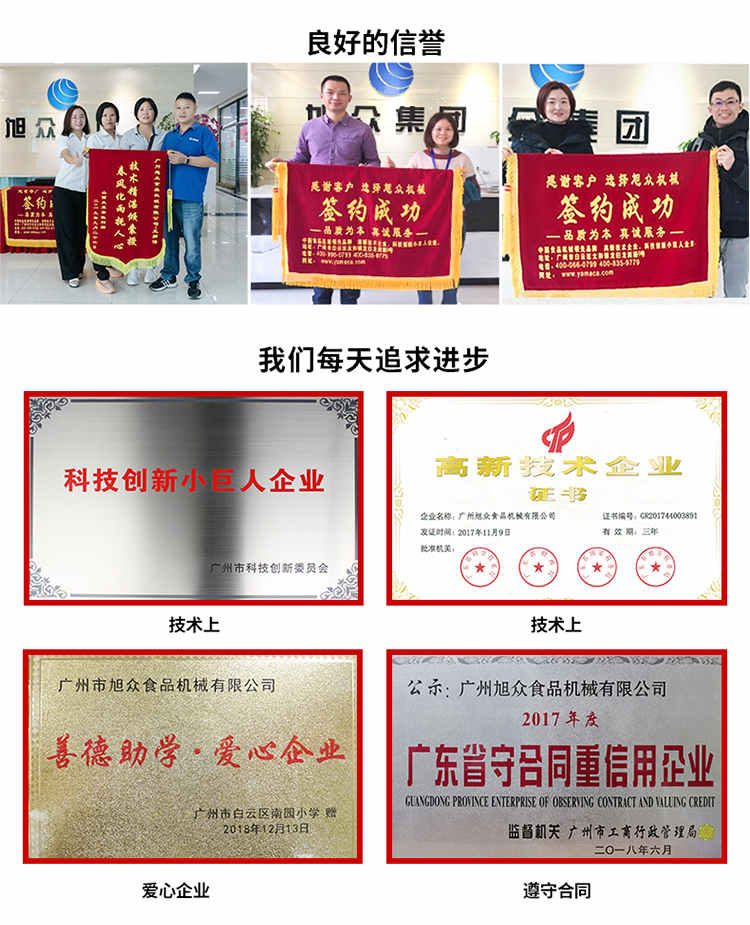 廣州旭眾食品機械有限公司是一家集科研開發(fā),生產設計,營銷服務為一體的現(xiàn)代化生產企業(yè)?,F(xiàn)代化生產車間,精湛制造技術,所產機械歷經市場重重考驗,不斷贏得海內外客戶的贊譽。