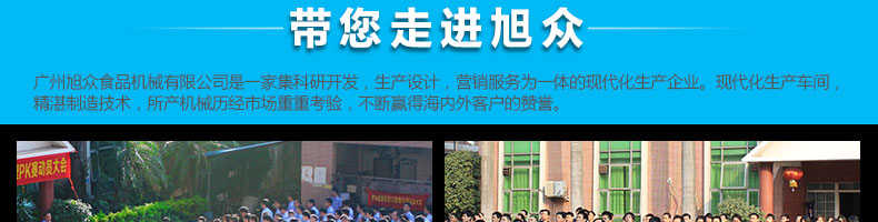 廣州旭眾食品機(jī)械有限公司是一家集科研開(kāi)發(fā),生產(chǎn)設(shè)計(jì),營(yíng)銷(xiāo)服務(wù)為一體的現(xiàn)代化生產(chǎn)企業(yè)?,F(xiàn)代化生產(chǎn)車(chē)間,精湛制造技術(shù),所產(chǎn)機(jī)械歷經(jīng)市場(chǎng)重重考驗(yàn),不斷贏(yíng)得海內(nèi)外客戶(hù)的贊譽(yù)。