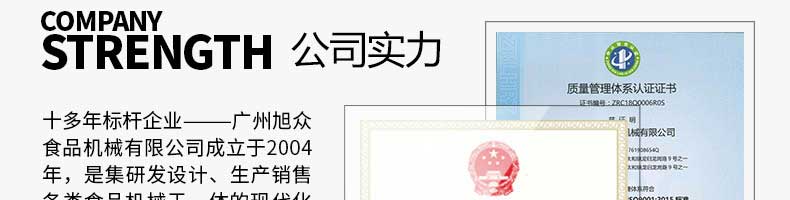 廣州旭眾食品機械有限公司是一家集科研開發(fā),生產(chǎn)設(shè)計,營銷服務(wù)為一體的現(xiàn)代化生產(chǎn)企業(yè)。現(xiàn)代化生產(chǎn)車間,精湛制造技術(shù),所產(chǎn)機械歷經(jīng)市場重重考驗,不斷贏得海內(nèi)外客戶的贊譽。