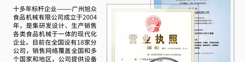 廣州旭眾食品機(jī)械有限公司是一家集科研開發(fā),生產(chǎn)設(shè)計,營銷服務(wù)為一體的現(xiàn)代化生產(chǎn)企業(yè)?,F(xiàn)代化生產(chǎn)車間,精湛制造技術(shù),所產(chǎn)機(jī)械歷經(jīng)市場重重考驗,不斷贏得海內(nèi)外客戶的贊譽。