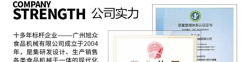廣州旭眾食品機(jī)械有限公司是一家集科研開發(fā),生產(chǎn)設(shè)計(jì),營銷服務(wù)為一體的現(xiàn)代化生產(chǎn)企業(yè)。現(xiàn)代化生產(chǎn)車間,精湛制造技術(shù),所產(chǎn)機(jī)械歷經(jīng)市場重重考驗(yàn),不斷贏得海內(nèi)外客戶的贊譽(yù)。
