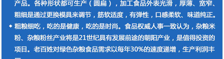 SZ-350多功能米粉機,生產(chǎn)多樣性可生產(chǎn)米粉、米線、粉絲、粉條、、年糕、玉米面條、各種雜糧粉絲、各種面條、雜糧面條、彩色面條以及以紅薯、玉米、大豆、蠶豆等制成淀粉為原料的等多種食品而且每種食品厚薄、粗細(xì)等規(guī)格可根據(jù)需要任意調(diào)整。