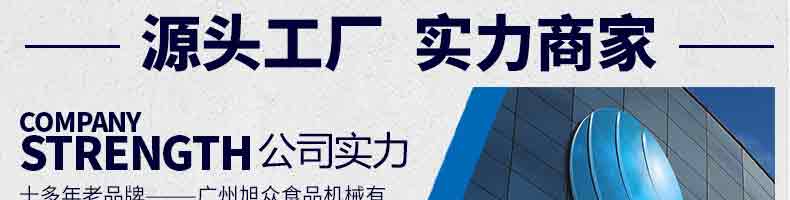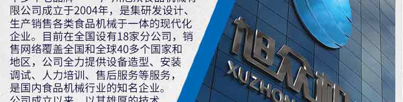 廣州旭眾食品機械有限公司是一家集科研開發(fā),生產設計,營銷服務為一體的現(xiàn)代化生產企業(yè)?,F(xiàn)代化生產車間,精湛制造技術,所產機械歷經市場重重考驗,不斷贏得海內外客戶的贊譽。