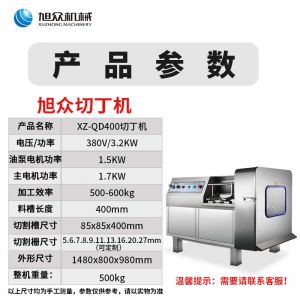 名稱XZ-QD400切丁機(jī) 電源380V 功率主:3.2KW。油泵電機(jī)功率1.5KW,主機(jī)電機(jī)功率1.7KW 產(chǎn)量500-600kg 尺寸切割槽尺寸85X85X400mm,外形尺寸1480X800X980mm 重量500KG 規(guī)格料槽長(zhǎng)度400mm,切割柵尺寸5/6/7/8/9/11/13/16/20/27(mm)(可定制) 其他