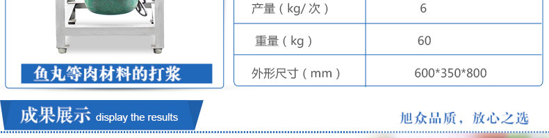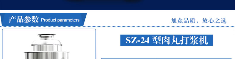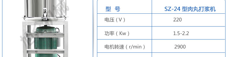 名稱SZ-24型高速肉丸打漿機(jī) 電源220/380V(見(jiàn)機(jī)器銘牌) 功率1.5-2.2kw/3kw 產(chǎn)量6千克/小時(shí) / 10千克/小時(shí) 尺寸355*405*950mm / 800*400*950mm 重量55kg/130kg 規(guī)格 其他