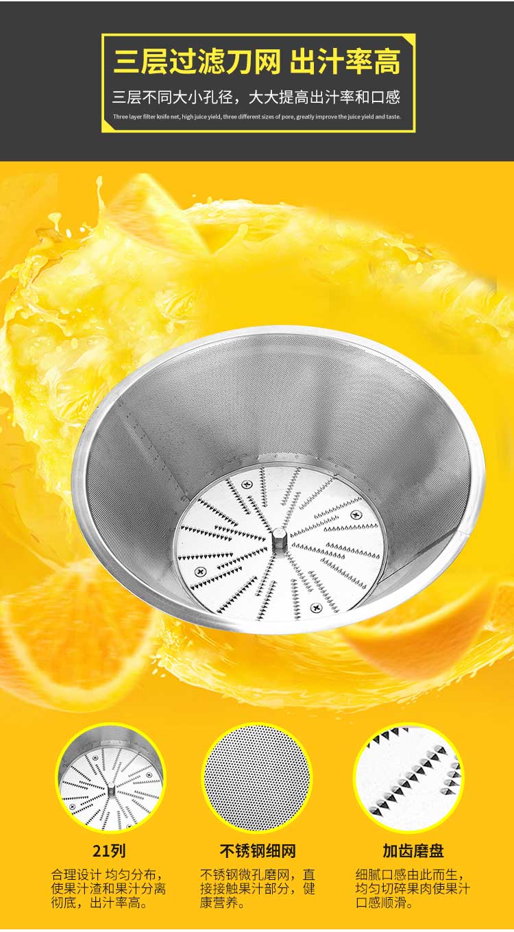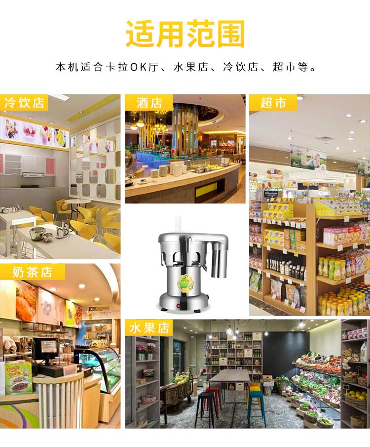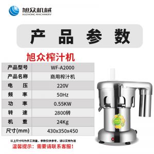 WF-A2000商用榨汁機(jī),該機(jī)所榨出的汁液是現(xiàn)榨的原汁,不含任何人為的防腐劑、穩(wěn)定劑、色素、香精、水等,凡與榨汁接觸的原件均為不銹鋼和無毒塑料聚丙烯和 A.B.S,食用安全。