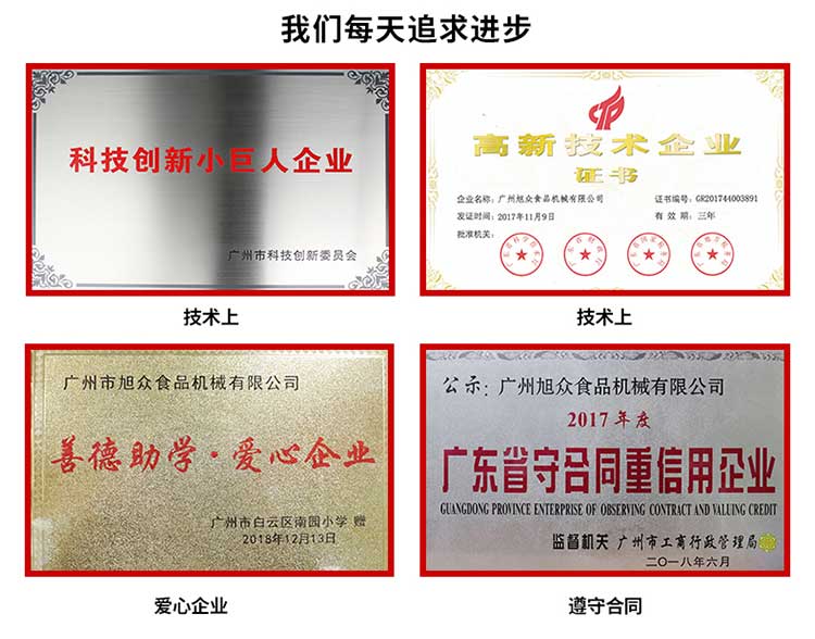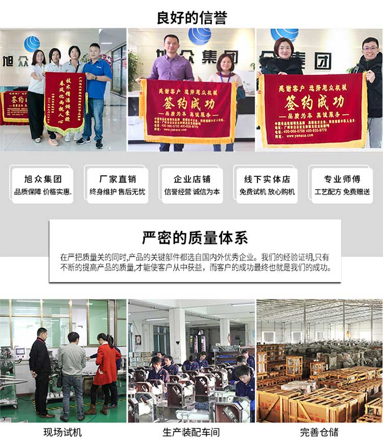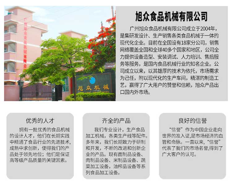 廣州旭眾食品機(jī)械有限公司是一家集科研開發(fā),生產(chǎn)設(shè)計(jì),營(yíng)銷服務(wù)為一體的現(xiàn)代化生產(chǎn)企業(yè)。現(xiàn)代化生產(chǎn)車間,精湛制造技術(shù),所產(chǎn)機(jī)械歷經(jīng)市場(chǎng)重重考驗(yàn),不斷贏得海內(nèi)外客戶的贊譽(yù)。