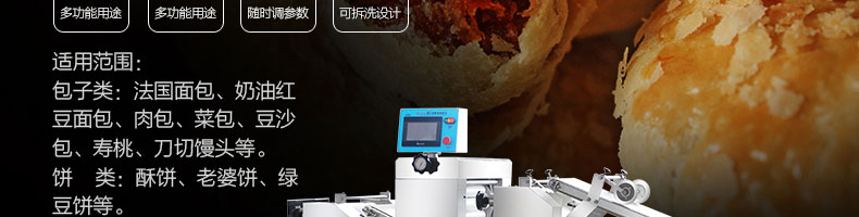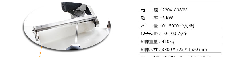 名稱xz-15c三道搟面酥餅機 電源220/380V(見機器名牌) 功率3kw 產(chǎn)量0-5000個/小時 尺寸主機尺寸3300*725*1520mm,成型機尺寸1550*800*820mm,出餡機尺寸870*4 重量410+110+170kg 規(guī)格10-150克/個 其他