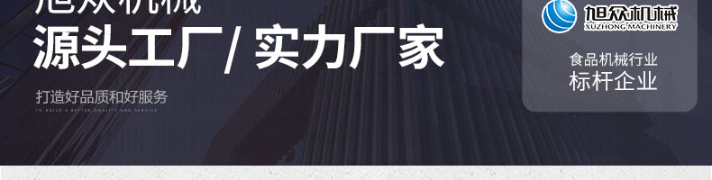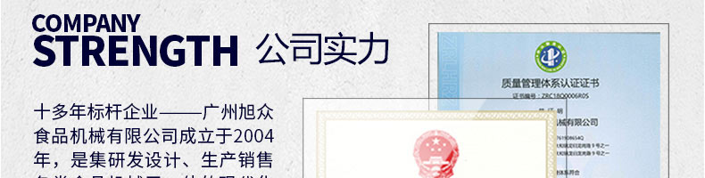 廣州旭眾食品機(jī)械有限公司是一家集科研開發(fā),生產(chǎn)設(shè)計,營銷服務(wù)為一體的現(xiàn)代化生產(chǎn)企業(yè)。現(xiàn)代化生產(chǎn)車間,精湛制造技術(shù),所產(chǎn)機(jī)械歷經(jīng)市場重重考驗,不斷贏得海內(nèi)外客戶的贊譽(yù)。