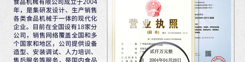 廣州旭眾食品機(jī)械有限公司是一家集科研開發(fā),生產(chǎn)設(shè)計,營銷服務(wù)為一體的現(xiàn)代化生產(chǎn)企業(yè)?,F(xiàn)代化生產(chǎn)車間,精湛制造技術(shù),所產(chǎn)機(jī)械歷經(jīng)市場重重考驗,不斷贏得海內(nèi)外客戶的贊譽。