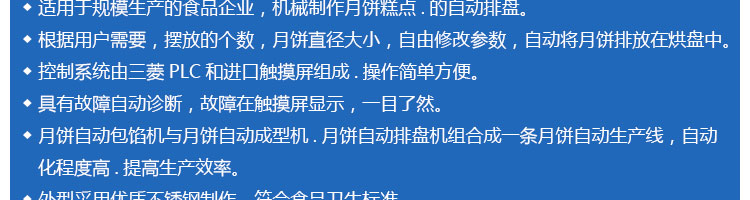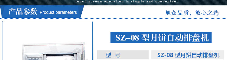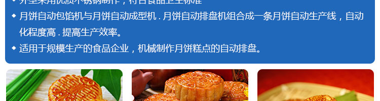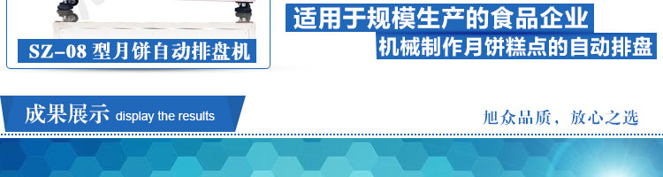 SZ-08型月餅自動排盤機,可同于制作各種月餅。適用于蛋糕房、休閑食品廠、食品加工產(chǎn)、面包房、月餅加工廠、超市、學校、食堂等各種工作場所??蓾M足不同客戶群體。免費提供工藝技術(shù)。