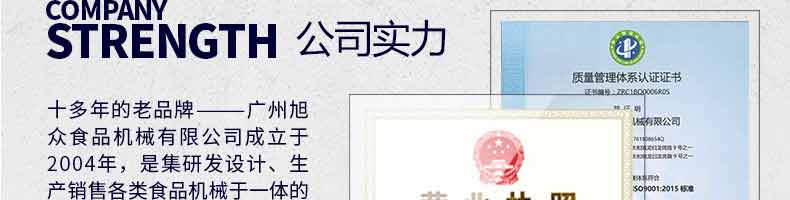 廣州旭眾食品機(jī)械有限公司是一家集科研開(kāi)發(fā),生產(chǎn)設(shè)計(jì),營(yíng)銷(xiāo)服務(wù)為一體的現(xiàn)代化生產(chǎn)企業(yè)?,F(xiàn)代化生產(chǎn)車(chē)間,精湛制造技術(shù),所產(chǎn)機(jī)械歷經(jīng)市場(chǎng)重重考驗(yàn),不斷贏得海內(nèi)外客戶的贊譽(yù)。