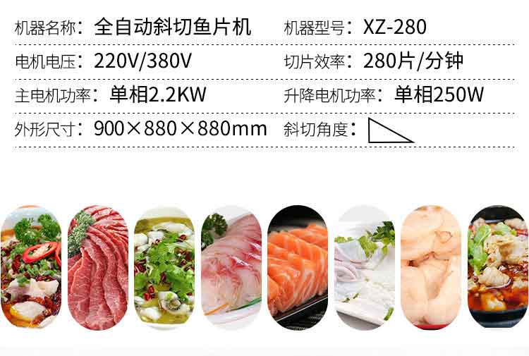 名稱XZ-280斜切魚片機 電源220/380V 功率單相2.2kw 產(chǎn)量 尺寸900×880×880mm 重量 規(guī)格 其他