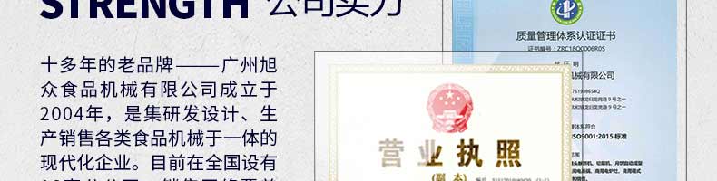 廣州旭眾食品機(jī)械有限公司是一家集科研開發(fā),生產(chǎn)設(shè)計(jì),營銷服務(wù)為一體的現(xiàn)代化生產(chǎn)企業(yè)?,F(xiàn)代化生產(chǎn)車間,精湛制造技術(shù),所產(chǎn)機(jī)械歷經(jīng)市場重重考驗(yàn),不斷贏得海內(nèi)外客戶的贊譽(yù)。