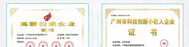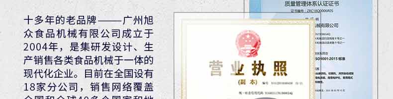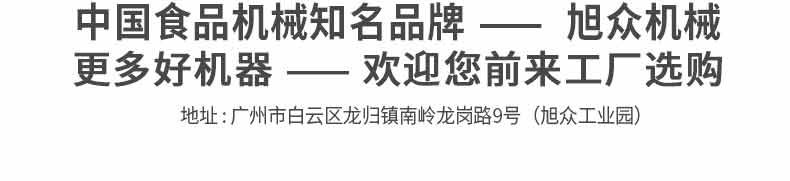 廣州旭眾食品機械有限公司是一家集科研開發(fā),生產設計,營銷服務為一體的現(xiàn)代化生產企業(yè)?,F(xiàn)代化生產車間,精湛制造技術,所產機械歷經市場重重考驗,不斷贏得海內外客戶的贊譽。