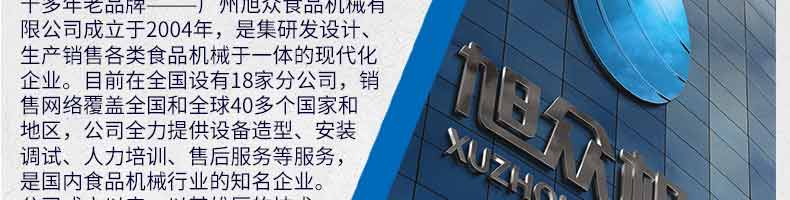 廣州旭眾食品機械有限公司是一家集科研開發(fā),生產(chǎn)設(shè)計,營銷服務為一體的現(xiàn)代化生產(chǎn)企業(yè)?,F(xiàn)代化生產(chǎn)車間,精湛制造技術(shù),所產(chǎn)機械歷經(jīng)市場重重考驗,不斷贏得海內(nèi)外客戶的贊譽。